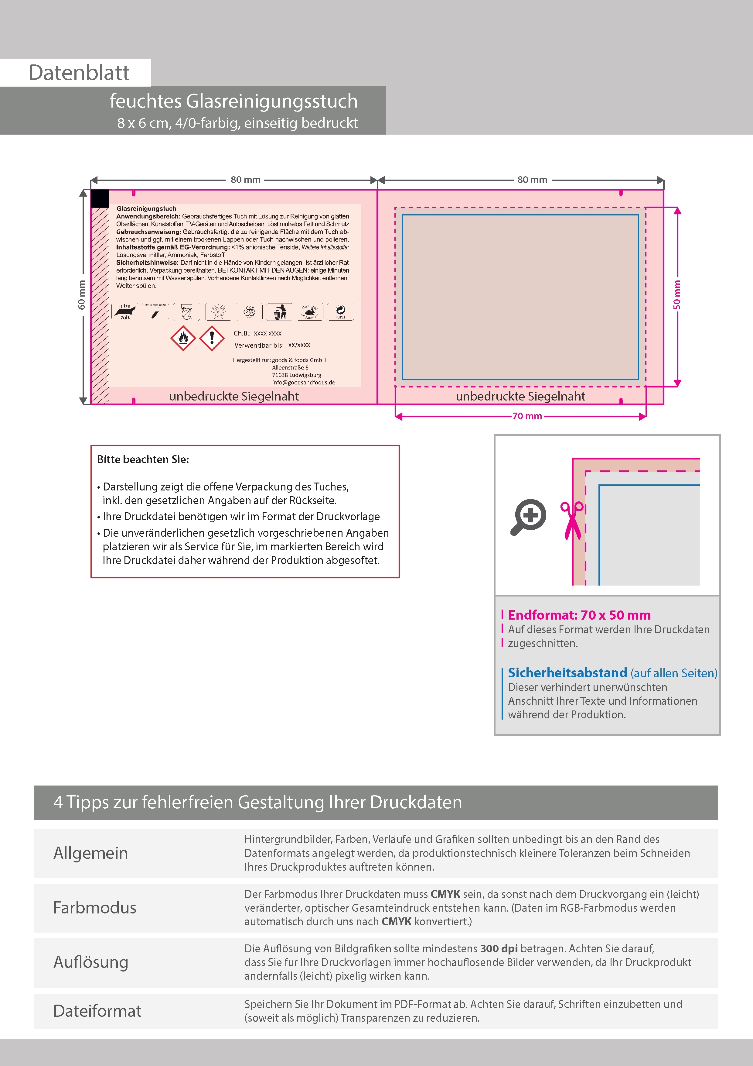 Feuchtes Glas-Reinigungstuch, 8 x 6 cm, 4/0-farbig einseitig bedruckt